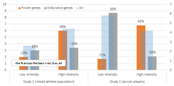- comparing training according to training in discordance with your genotype(s) yields differences that range from 55% up to 610% (the latter in the soccer players on the low intensity regimen for CMJ; Figure 1, study 2 / low intensity)